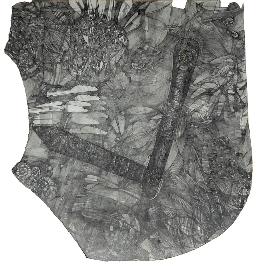 For Raya Bruckenthal (b. 1975), the past two years prompted an almost primal turn toward printmaking. In the days following October 7, she began a residency at the Jerusalem Print Workshop, where she produced a series of images that resemble angel wings or cherubim composed entirely of knives. What initially appears from a distance as a radiant Native American feather headdress reveals itself up close as fragments of a mythical figure titled Angel of Hysteria, echoing the verse from Genesis: “He banished the human, and stationed the cherubim at the east of Eden, along with the revolving sword blade, to guard the path to the Tree of Life” (3:24). A related blade motif appears in a cut drawing dedicated to the circumcision knife—a sacred instrument marking Jewish male identity and belonging.