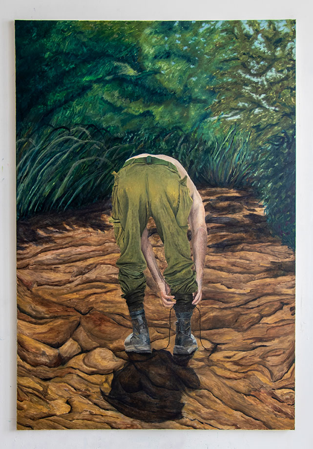 The realistic, figurative oil paintings of Elkana Levi (b. 1993) began in a sketchbook he carried with him through repeated rounds of reserve duty. From the first days of the fighting—when he was deployed to the northern border as a self-propelled artillery commander—these drawings gradually developed into large-scale oil paintings, produced in his Jerusalem studio during brief intervals between deployments. The slow, deliberate work in oil became a means of psychological processing: a way to contend with the constant tension and compressed time of the battlefield.