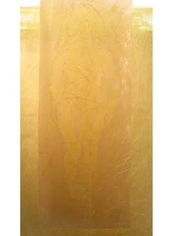 נחמה גולן מפגישה במיצב הקיר שלה בין שני צירי זמן: טרום החטא הקדמון והזמן שלאחר החטא. על מעין גוויל עשוי מנייר ודבקים מואר המדמה עור אנושי, מופיע ציור של דמויות אסורות בחוטי נחושת. מאחוריו תלוי גליל נוסף פרוס כמגילה כשבתחתיתו הכיתוב "חטאחטאחטאחטא".