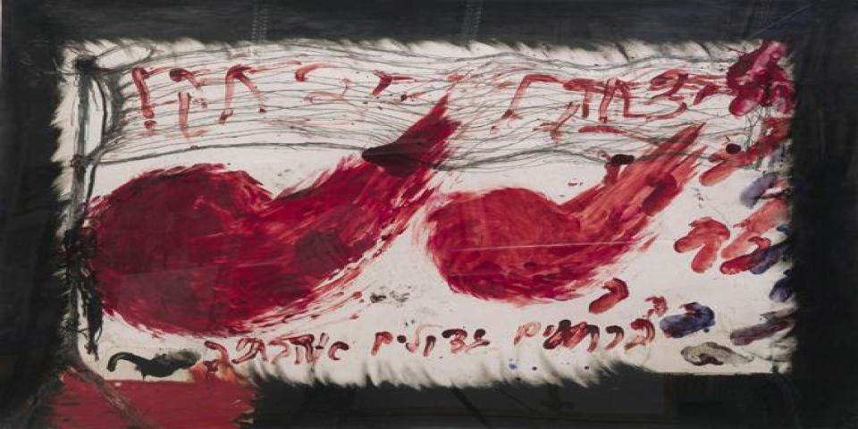 | רות קסטנבאום בן-דב, ללא כותרת (משנה אבות ג', ט'), 1998. שמן על בד וטקסט על עץ |