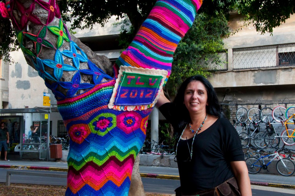 "פניתי לאנשים הנכונים בעירייה וביקשתי לקבל רשות לכסות כמה עצים בשדרות רוטשילד בסריגה", היא מספרת, "הסברתי לפונקציונרים בעירייה שזו אמנות רחוב לכל דבר, והם הסכימו שאעשה פיילוט. הבאתי עוד שתי חברות, וכל אחת קיבלה עץ, מדדה אותו ואת הענפים שלו, הלכה הביתה וסרגה לו כיסוי. אנשים התלהבו בטירוף מזה, עצרו והצטלמו, וגם ראש העיר היה מבסוט. לצערי, לא הרחבנו את הפיילוט כי היו עוברי אורח שחיבלו בסריגה, חתכו את החוטים ואפילו שרפו. לשמחתי, בירושלים ראו את העבודות שלנו ואהבו מאוד, ובקרוב אנחנו נעשה פרויקט דומה ברחוב עמק רפאים".
