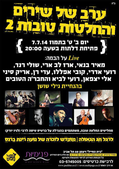 אבל איזו רשימה של זמרים: מאיר בנאי וקובי אפללו וארז לב ארי ורועי אדרי ועדי רן ואריק סיני, ולפינאלה, שולי רנד - רובם עם נגני הליווי רועי לביא והחבר'ה הטובים, והנה גם יצפאן מרים את הקהל בבדיחות על מרוקאים ("למה, אני בלגי?"), ובתווך כמה סרטונים קומיים מתוצרת מקומית וגם אמנים נודעים פחות, והמארח יובל ברנס משעשע את הקהל בסיפור על אשתו המנוחה, ואשרינו שזכינו הערב גם לסיים קריאת מסכת (סוטה) בפני קהל גדול שכזה - והאירוע שנפתח לקראת שמונה נמשך ומתגלגל עד הרבה אחרי חצות, והמוזיקאים המצוינים, מתודלקים בוודקה ובעראק כמנהג החסידות, מספקים תמורה מלאה בעבור הכרטיס (60 שקל במכירה מוקדמת, 80 בקופה), שגם ככה עניינה המרכזי הוא תרומה לבתי חב"ד בתל אביב.