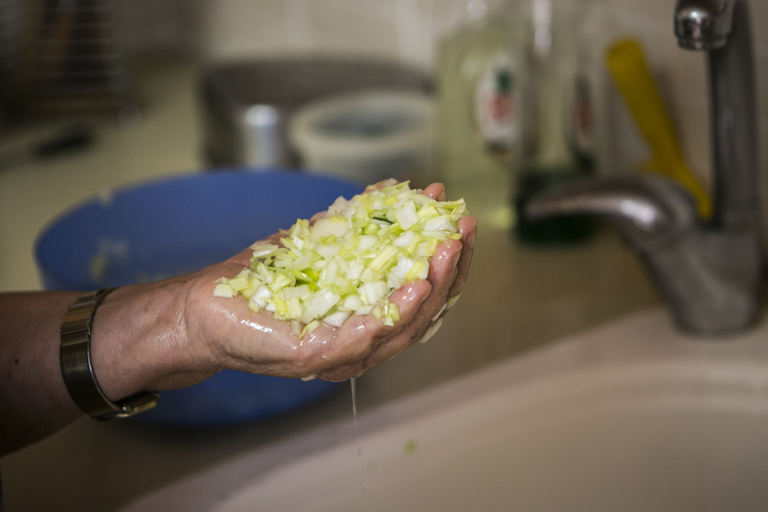 קוצצים - שוטפים את הכרישה הקצוצה במים זורמים