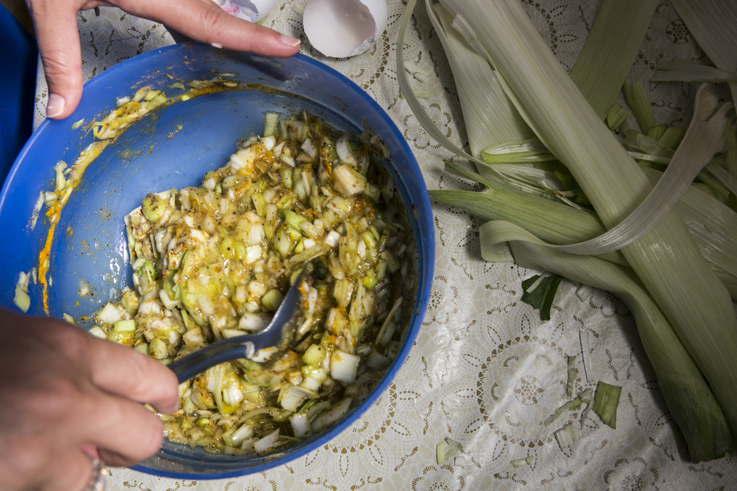 - מפזרים מלח מעל הכרישה הקצוצה ומועכים עם הידיים כך שכל הנוזלים ייצאו והכרישה תמעך