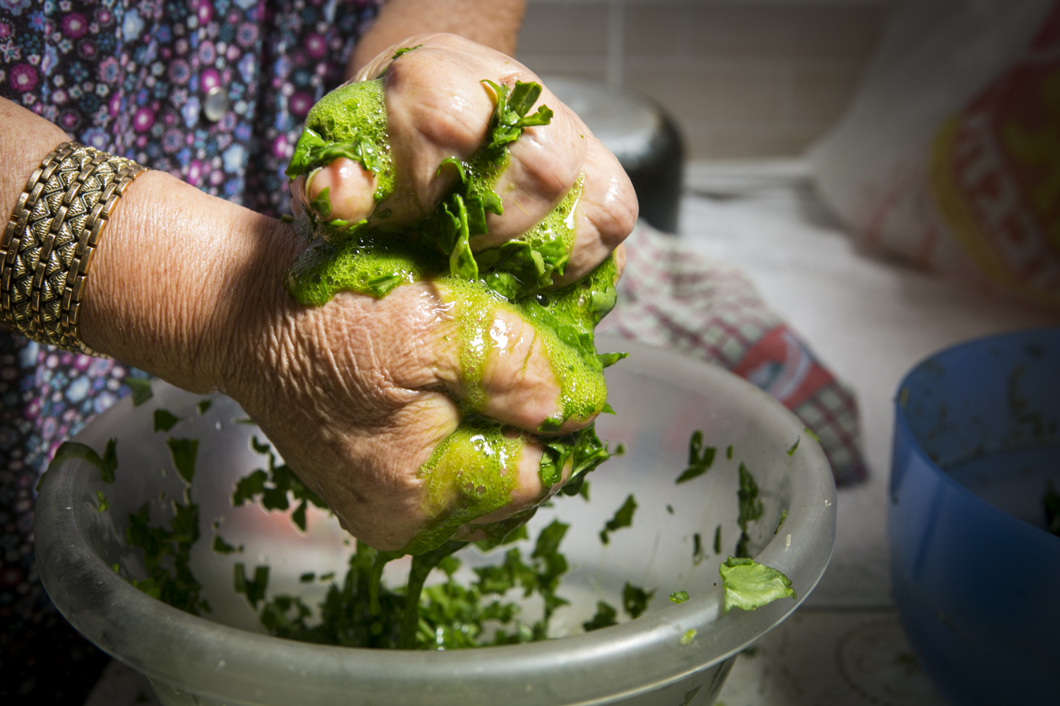 קוצצים - שוטפים את העלים הקצוצים במים זורמים, מפזרים מלח מעל התערובת ומועכים עם הידיים, כך שכל הנוזלים ייצאו והעלים יידבקו.