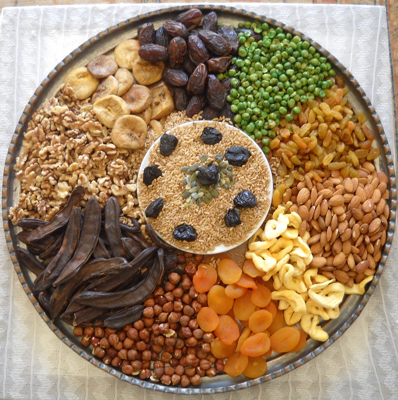 גם במשפחה שלי מתייחסים לט"ו בשבט ברצינות רבה, אולם לא בדיוק על פי כללי הטקס האפגני המסורתי. המשפחה המורחבת נפגשת בערב החג לארוחה "ישראלית", שכוללת פלאפל, פיתות וסלטים. אחרי הארוחה, כולם עוצמים את העיניים, בזמן שמארחי הסדר מביאים מחדר אחר צלחות חג עמוסות בכל טוב, אחת לכל אחד. הצלחות מתפקעות מרוב פירות יבשים, חיטה קלויה, אגוזים ודגנים מסוגים שונים ושלל ממתקים. על השולחן נהוג להניח, לא 30, ואפילו לא שנים עשר מינים, אלא את שבעת המינים בלבד, שמסמלים את החיבור של החג לארץ ישראל.