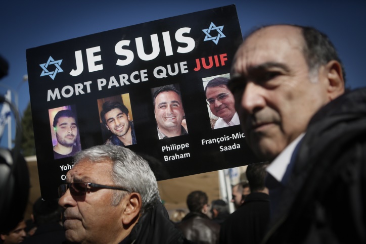 ![]() הפגנה של יהודי צרפת במהלך הלוויית אחד מנספי הפיגוע בהיפר כשר, 2015 (מרים אלסטר) |