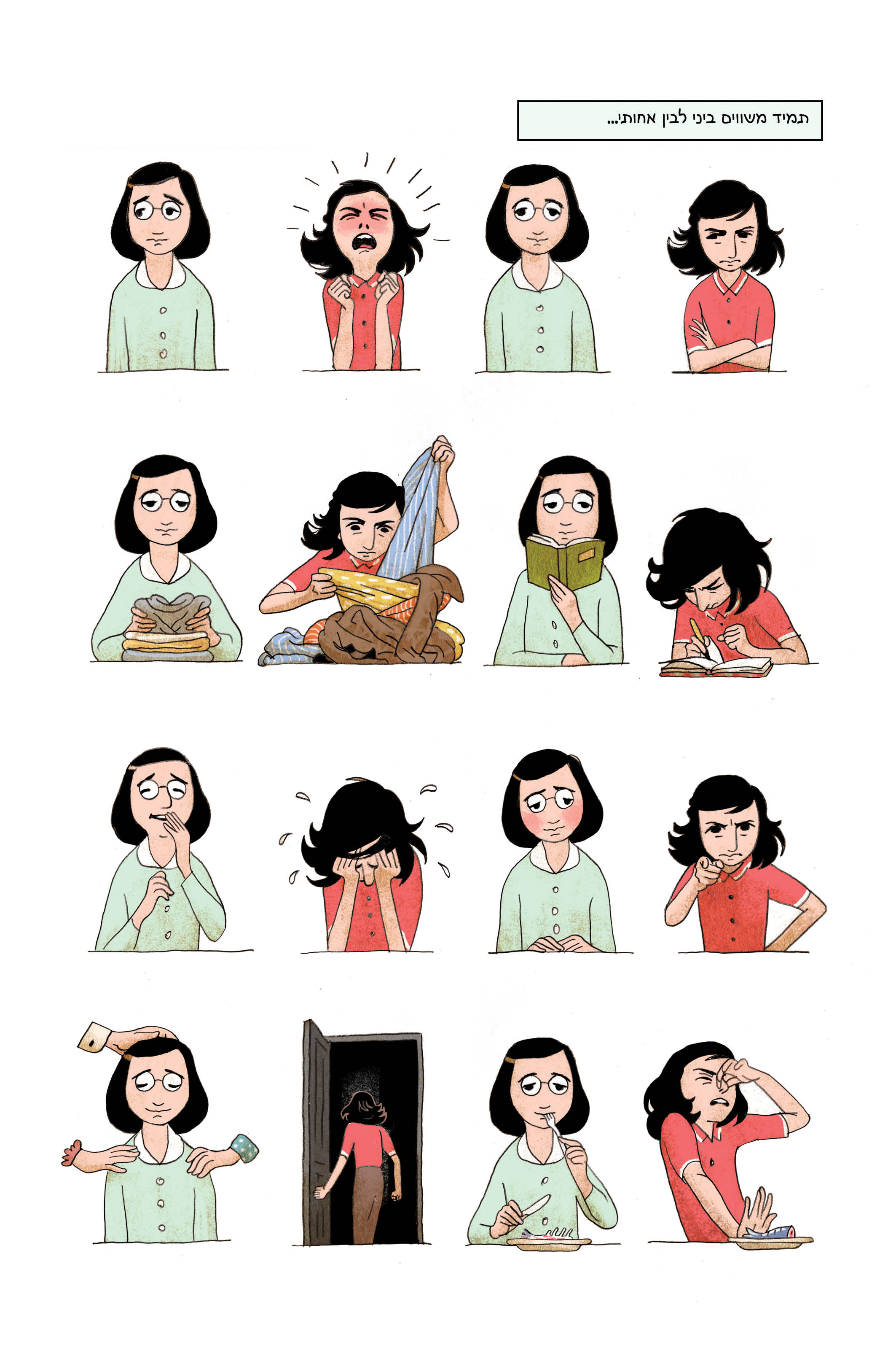 ועם זאת, מדי פעם בפעם מושתל איור מסוג אחר: אלה איורים שמתארים את סיוטי הלילה של אנה, את הפחדים שלה או ידיעות על העולם שמחוץ למחבוא, וצבעיהם כחולים-חומים. שילובם בתוך עמוד אחד נעשה באופן חכם. למשל: בציור אחד אנה מדמיינת תהלוכה צבעונית עם הנסיכה ג'וליאנה ובתה התינוקת, ובציור שמתחתיו, שמתאר את מחשבותיה בלילה, מיטתה מרחפת מעל עולם זוועתי.