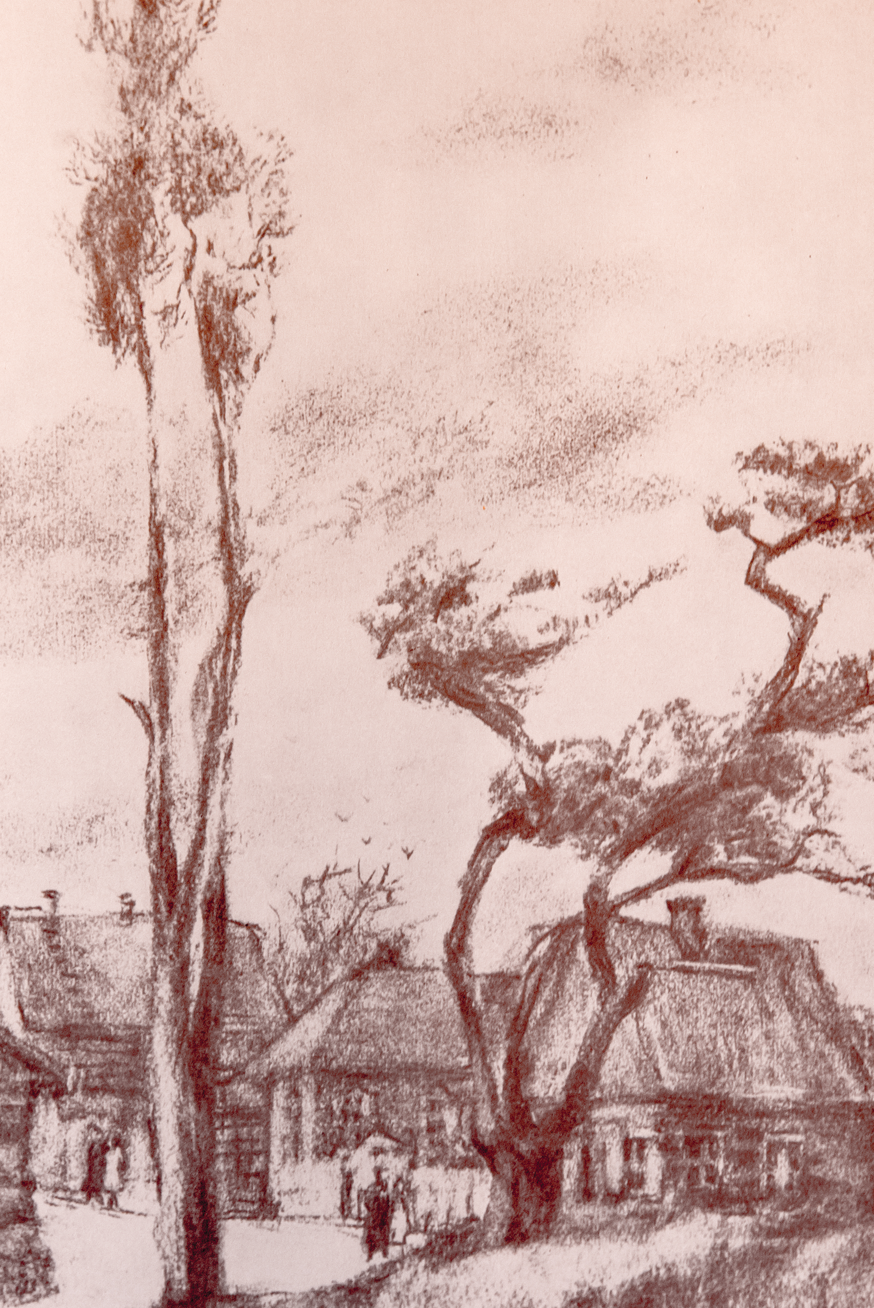 Despite the horrors, his 1951 works titled Rogachov: Morning and Rogachov: Sunny Day are poignant depictions of the town as he remembered it before the travesties of the war. Wooden houses, tall trees, people walking together, white goats and animals caught in the rain. Yet he also draws small birds that appear above branches of trees flying through a cloudy sky. Perhaps they represent ethereal memorials to all those whom Kaplan lost.