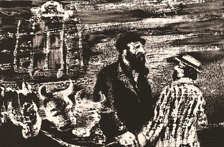 Kaplan’s deep feelings of mourning for the world that is no more are particularly seen in these works that he created from 1966 to 1969 for this bittersweet story about a crippled beggar named Fishke, his love for a hunchbacked girl named Beylke, and the life of the shtetl’s cripples and thieves. The artworks immediately calls to mind the cemeteries of East Europe and the stone matzevot with engravings of scenes from the life of the departed. The visual effects Kaplan is able to achieve are quite astounding; the illustrations seem to be etched in stone, immediately setting the mood and providing a masterfully precise artistic interpretation.