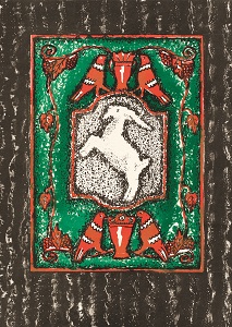 Finally, in his artworks for Chad Gadya, Kaplan uses Hebrew letters and drawings of goats, lions, birds, and other animals, replicating images often found on tombstones in Jewish cemeteries. These images were often used to symbolize life beyond death. In the Aesopian language that he was forced to use, Kaplan includes the Divine in his Chad Gadya after all.
