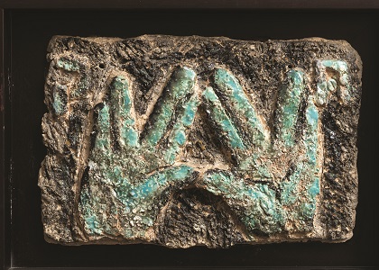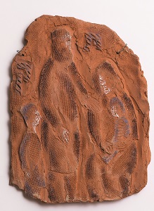 There are several especially moving ceramic pieces, some that Kaplan creates as sculptures, others as flat slabs that remind us of matzevot, that he dedicates to the memory of his family. One depicts his parents in their younger years, their names inscribed in Hebrew letters, an image of a lion24 above his father’s face, an image of a bird25 above his mother’s.