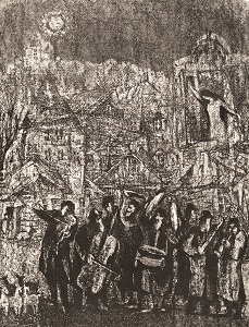 Kaplan created more than 100 separate illustrations for Stempenyu, playing with shade to create swirling, dancing, romantic images. These illustrations imbue shtetl life and people with poetic beauty and sparkling energy.