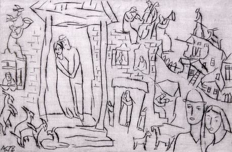 From 1963 to 1967, Kaplan creates artwork for Sholem Aleichem’s Stempenyu. Written in 1888, this was Sholem Aleichem’s first Jewish novel that offers rich detailed depictions of the Klezmer world, touches on the important cultural role that Klezmer musicians played, and also shows the town life within the Pale of Settlement.
