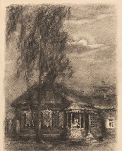 “[Kaplan] views the houses of his native city… with undisguised admiration. In his eyes, the structure of logs and planks, the rhythm of the old windows and steps conceals an infinite number of magical mysteries… you could say that… the poetry of his drawings is exclusively a matter of their piercing, stunning resemblance to reality – that special, unquestionable resemblance to reality that can be understood without comparing the drawing to the original… He sees and draws the houses through the prism of his miraculously surviving childhood impressions, through the mist of his memories, accentuating every little crack and every crooked twist of the roof with the everlasting sorrow felt for the passing joy of the first impression.”31