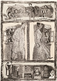Kaplan was over 50 years old when he began drawing for the stories of Sholem Aleichem. Yet when the artist placed himself alongside the writer in his lithographs, Kaplan drew himself as a man in his twenties. The world that Sholem Aleichem wrote about is the world that Kaplan had always been in love with. Kaplan knew this world from up close, from inside. Kaplan had absorbed the traditions and life of Rogachov, and despite all his years in Leningrad, he never forgot what he saw and felt as a child.