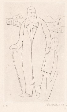 I was first introduced to the works of Anatoly Kaplan in the early 2000s, in a friend’s apartment in a Soviet-era high-rise apartment building on Malaya Bronnaya Street in Moscow. In the entrance hallway, next to where we took off our shoes, there was a small lithograph in a plain black frame, depicting an elderly bearded man in a coat, one hand resting on a walking stick, the other on the shoulder of a little boy. The old man gazed into the distance, beyond the frame, while the little boy stared happily up at the man who seemed to be the boy’s grandfather. Behind them, old wooden houses appeared, nestled close to each other, an unpaved road in front of them. Drawn with the thin lines of a needle and outlined in black ink, without color or paint, the lithograph portrayed an entire world that breathed with life.