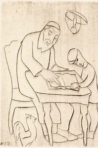 This was the start of Kaplan’s career as a book graphic artist. His illustrations drew on themes he would later repeat in his lithographs, paintings, etchings and ceramics: horse-drawn carriages, wooden houses, rooms with clocks on the walls, wooden beds, furnishings, framed pictures of older relatives, scenes from the villagers’ everyday life, modern looking men as well as bearded, cap-wearing old Jews who represented the old generation, scenes on riverbanks, children with goats and youth in rowing boats.