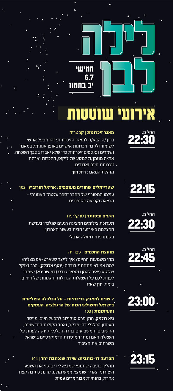 לאורך הלילה דייטים בספרית בית אבי חי, הרצאות, סדנאות, מוזיקה, פרפורמנס, מתחם לאונג' עם אוכל והקרנת סרטים על המסך הגדול בחצר ועוד הרבה הפתעות