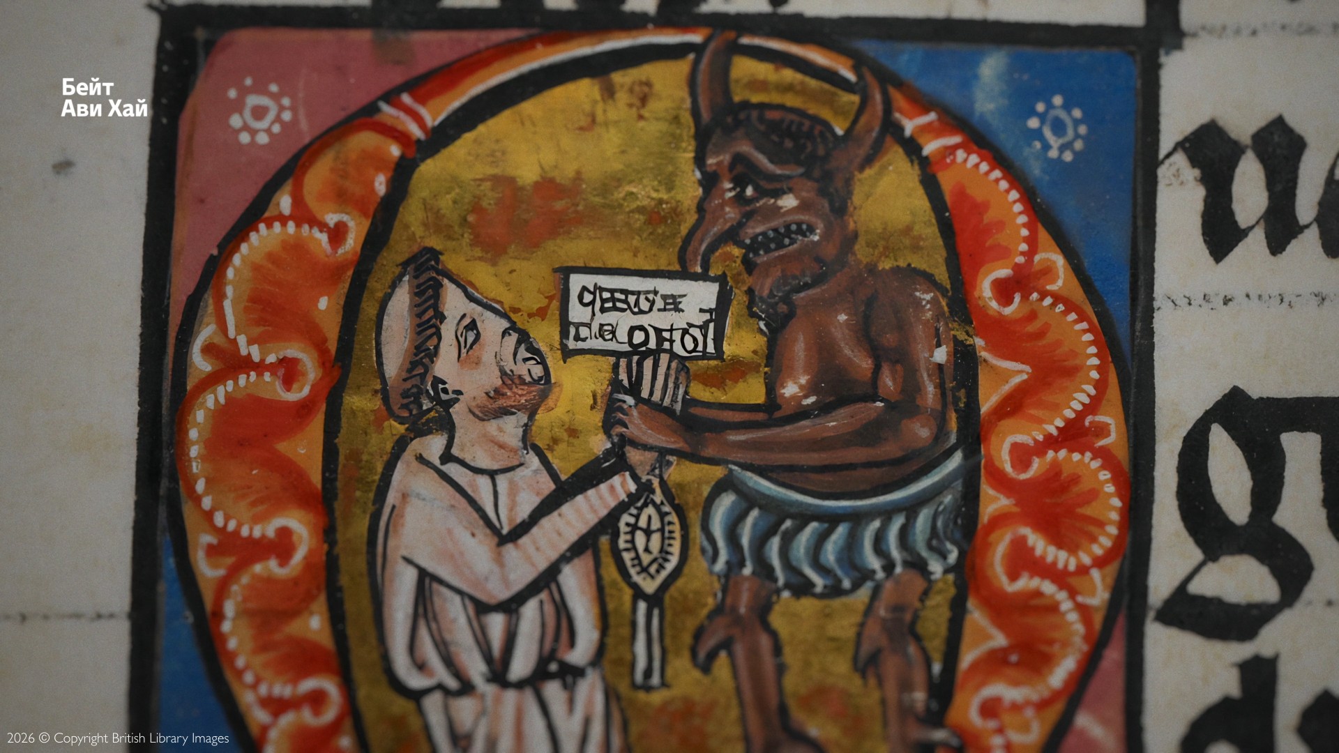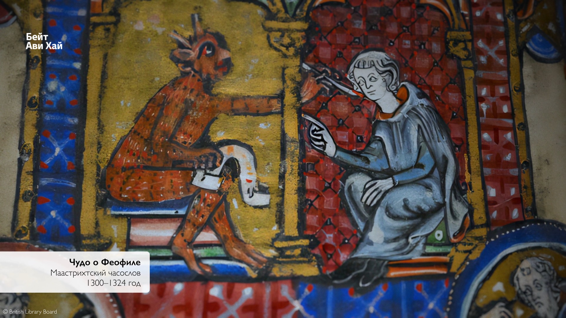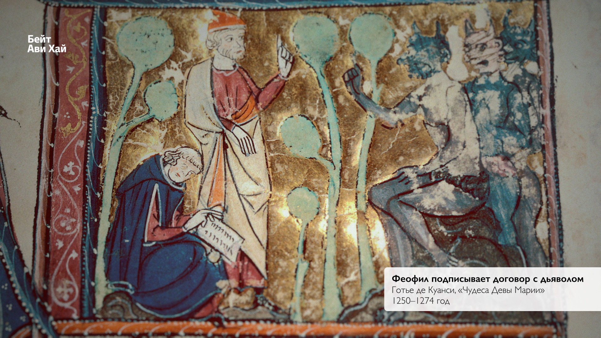 Это имитация феодального оммажа. Жест, который назывался immixtio manuum — «вложением рук». Чтобы стать вассалом какого-то сеньора, ему служить и получить от него феод, рыцарь вкладывал свои руки в его и становился его человеком (на латыни homo) — отсюда «оммаж». Тут Феофил признает себя вассалом дьявола — сеньора ада. Ритуал дополняется документом. По сюжету Феофил вручает дьяволу хартию, в которой отрекается от Бога и передает себя под власть нечистого. Тут этот документ, снабженный вислой печатью, держит в руках посредник-иудей