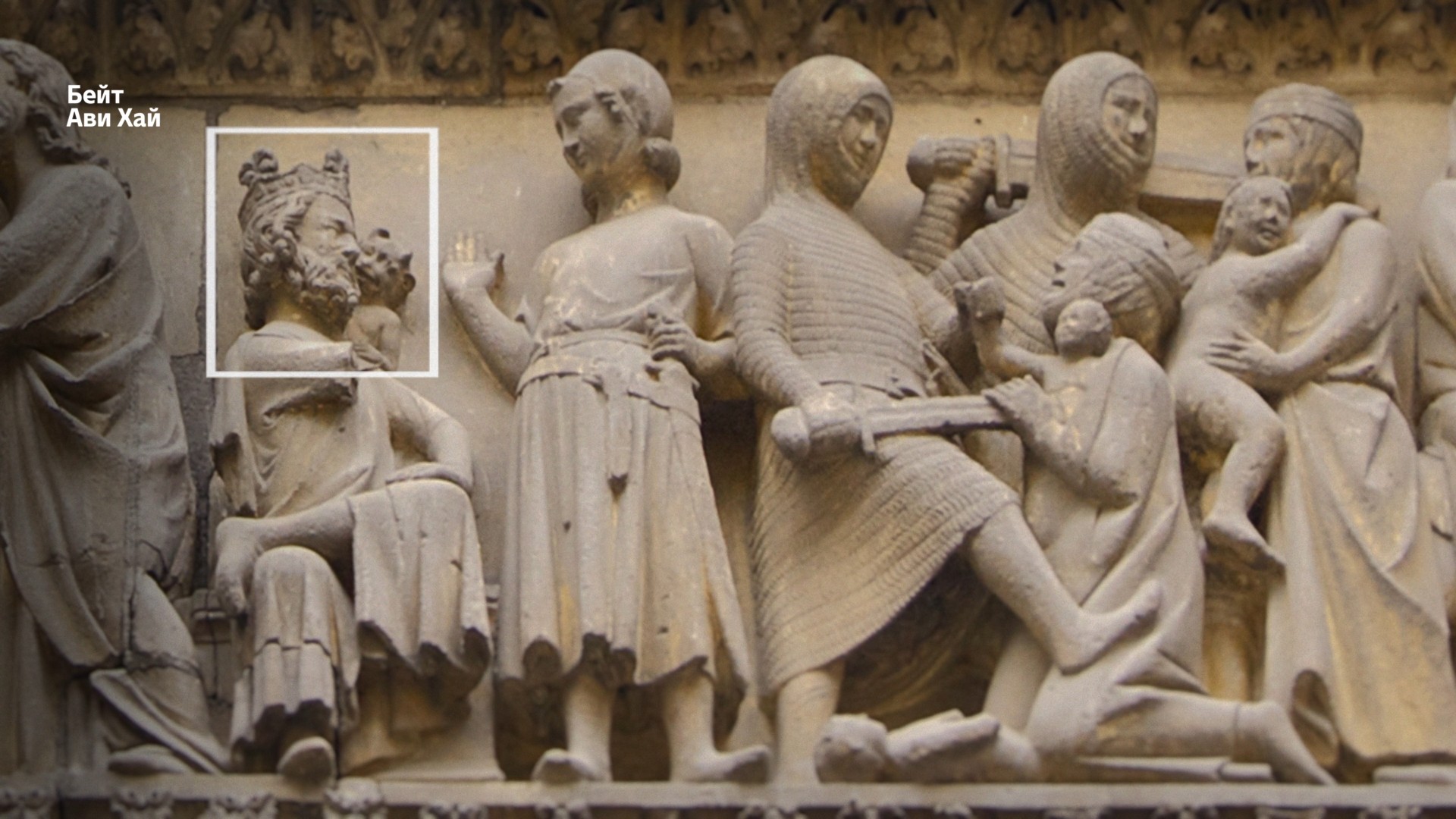 У его ног сидит маленький бес-советчик. И эта фигурка перекликается с такими же демоном, который ниже подсказывает царю Ироду преступную мысль перебить всех вифлеемских младенцев, чтобы уничтожить конкурента — Христа, новорожденного царя иудейского.