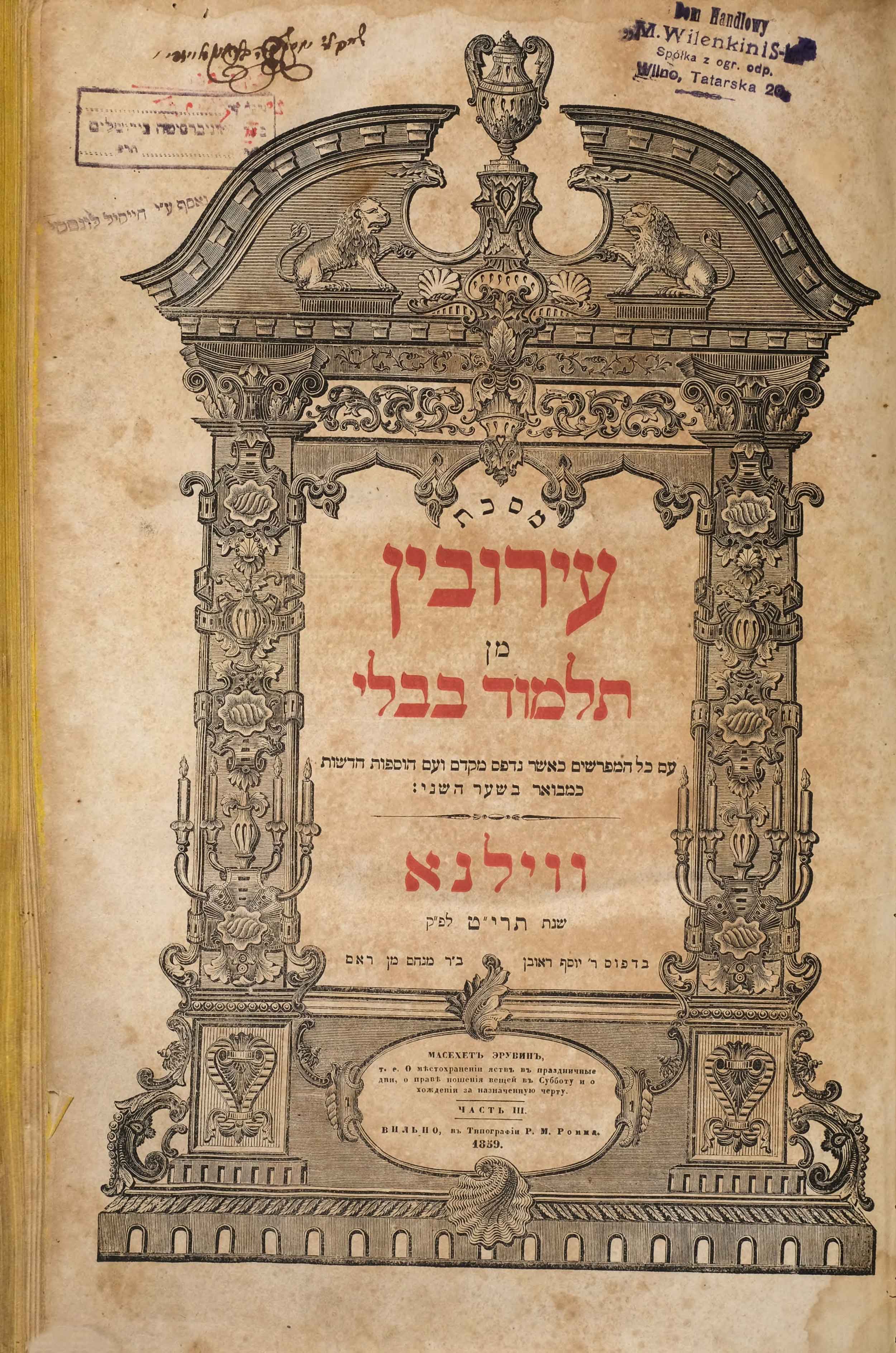 Красивая рамка, цветные буквы. Вот название трактата Эрувин из Вавилонского талмуда. Город, красные буквы. Второй, малый титульный лист — на русском языке, где мы читаем: 1859 год, типография братьев Ромм, Вильно. И даже о чем трактат Эрувин тут немного написано, что приятно. Я много видел этих изданий, и они действительно, без всякого снисхождения на то, что это XIX век, совершенно классические типографские шедевры.