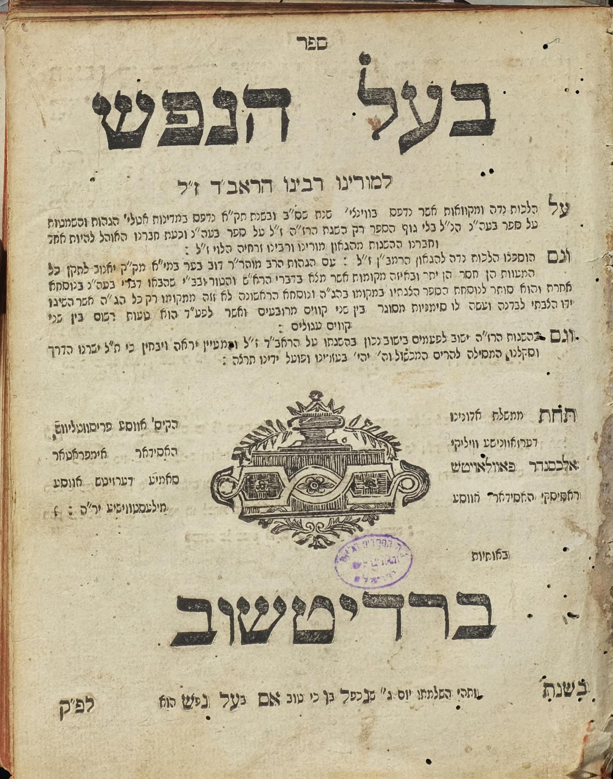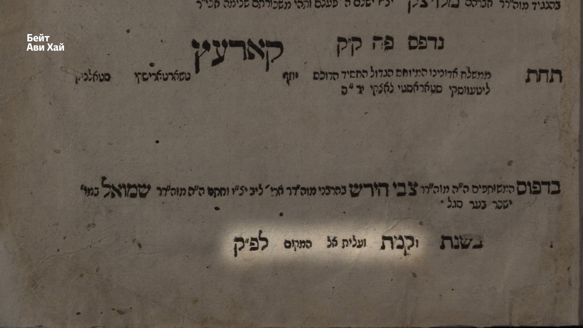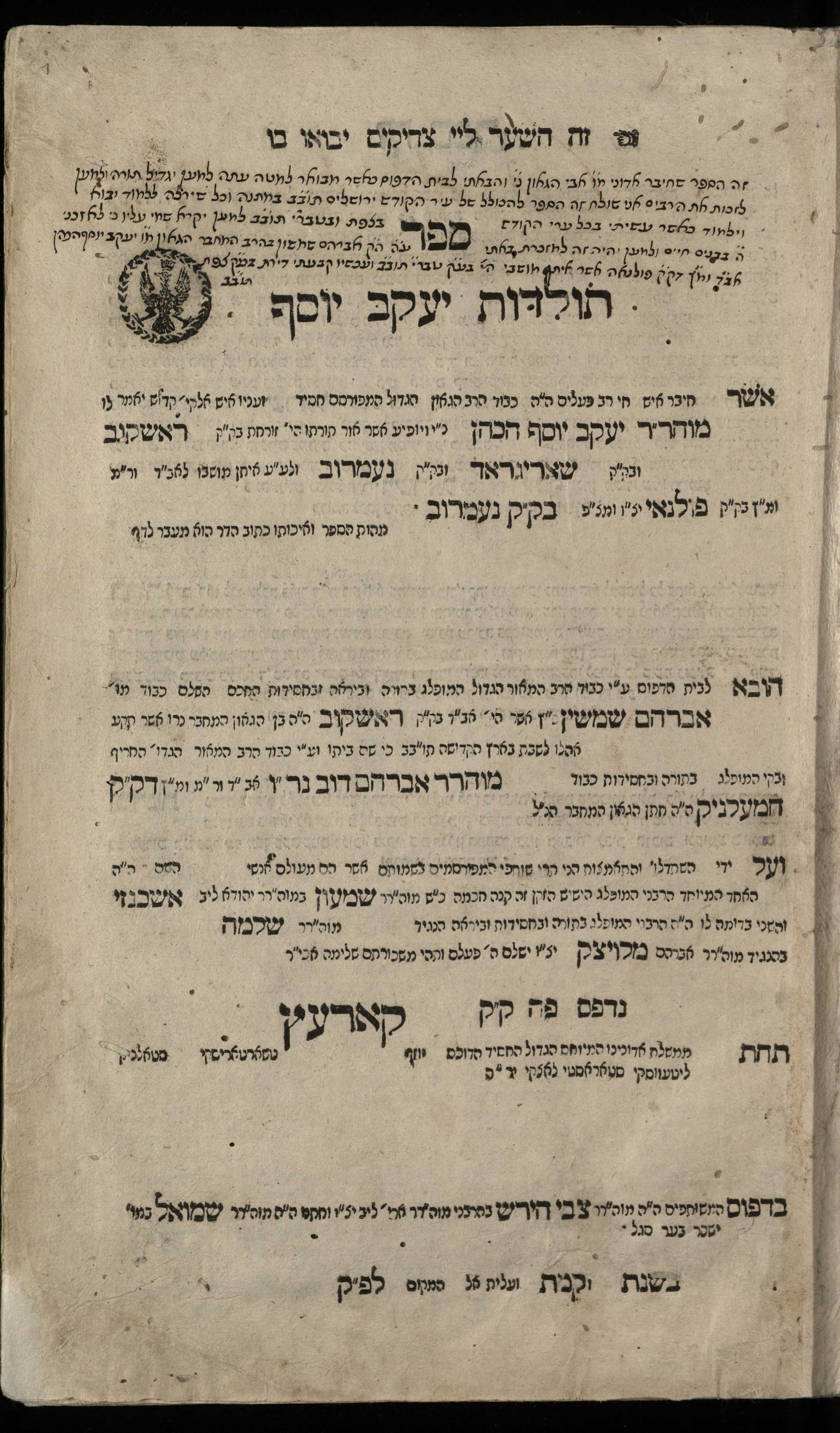 Я вам хотел показать несколько вещей здесь. Во-первых, и это во многом веяние нового времени, они всегда указывали, под чьим правлением находилось то или иное место, когда эта книга издавалась. И вот здесь прямо под городом написано — «Под правлением нашего высокородного (мейюхас), великого (ха-гадоль) и праведного (ха-хасид) господина Юзефа Чарторыйского — стольника литовского, старосты луцкого, да возвеличится слава его». И там еще аббревиатура в конце.