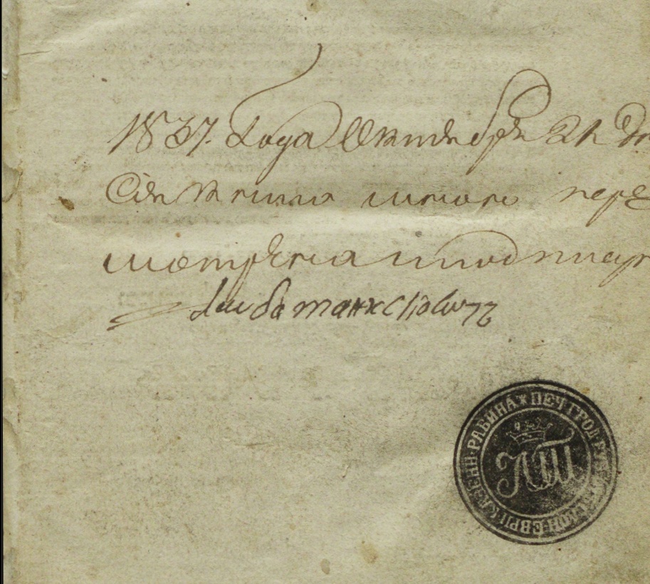 Смотрите, сразу видны три вещи. Во-первых, здесь видно, что текст написан профессиональным писцом: «1837-го года сентября 21-го дня сия книга пересмотрена и подписана». Дальше, цензор — еврей, вообще не факт, что он хорошо знал русский язык, он просто подписывает его. Тут Лейба Танхимович какой-то. А дальше еще стоит печать. Опять же, в середине — Лейба Т, это начало его фамилии, и печать казенного раввина. Все очень серьезно.