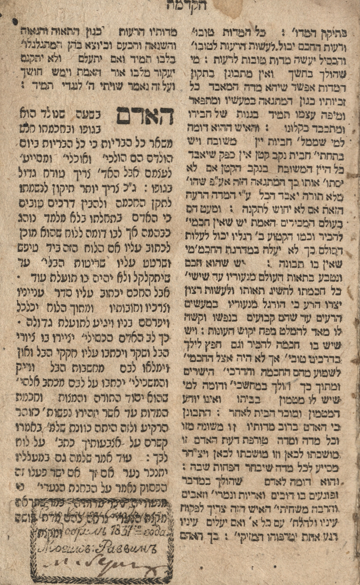 Что мы видим? 1837-й год, очень четко. Эту книгу одобрил могилевский раввин и подпись — Авербух, но вот здесь это не очень отчетливо. Этот раввин хорошо известен. А кто он? Он был казенным раввином, то есть раввином, назначенные от государства, посредником между государством и общиной.