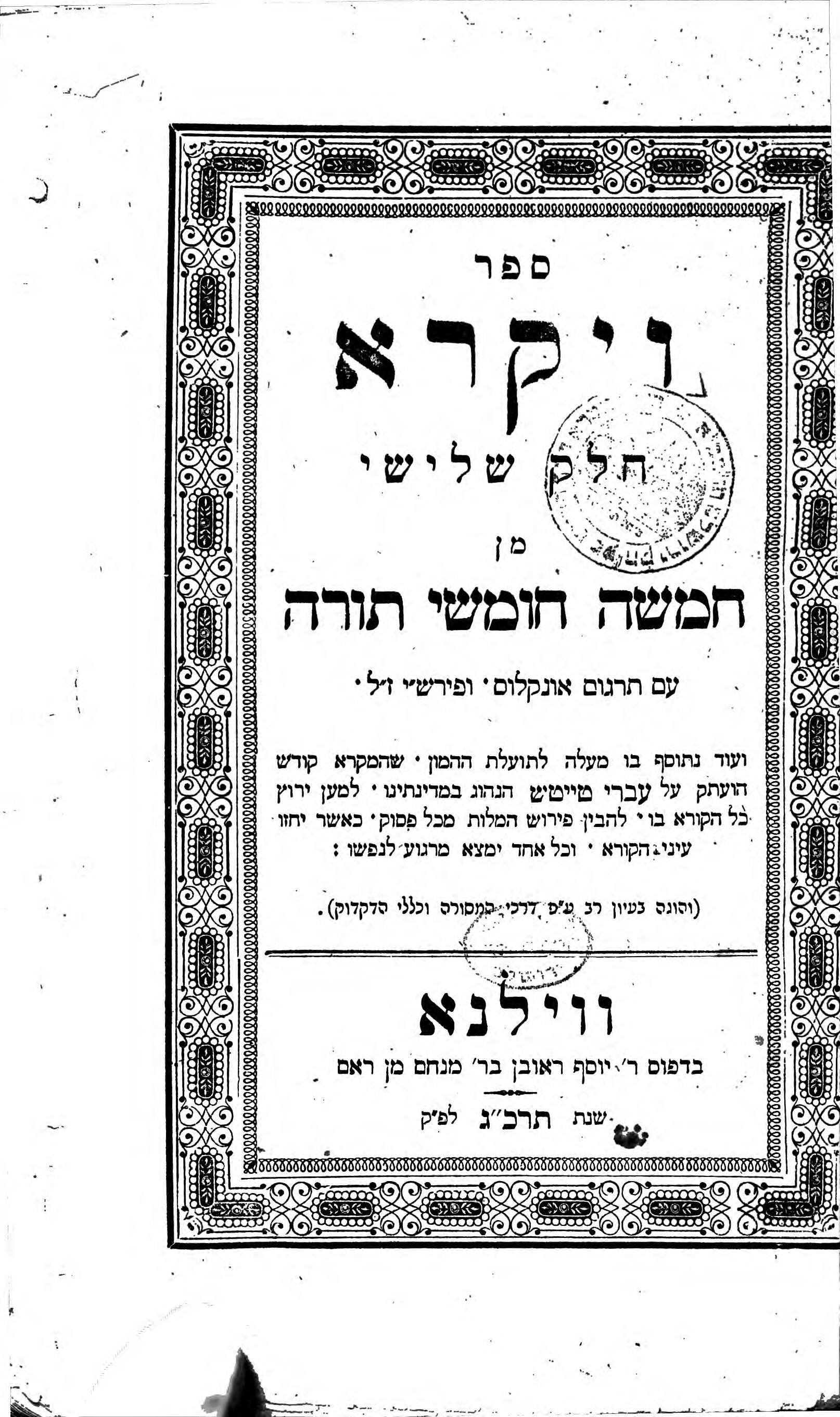 Давайте теперь посмотрим несколько изданий из Вильно, потому что это совершенно классические издания. Это Пятикнижие — Хамиша хумшей Тора, книга Ваикра, третья часть Торы.