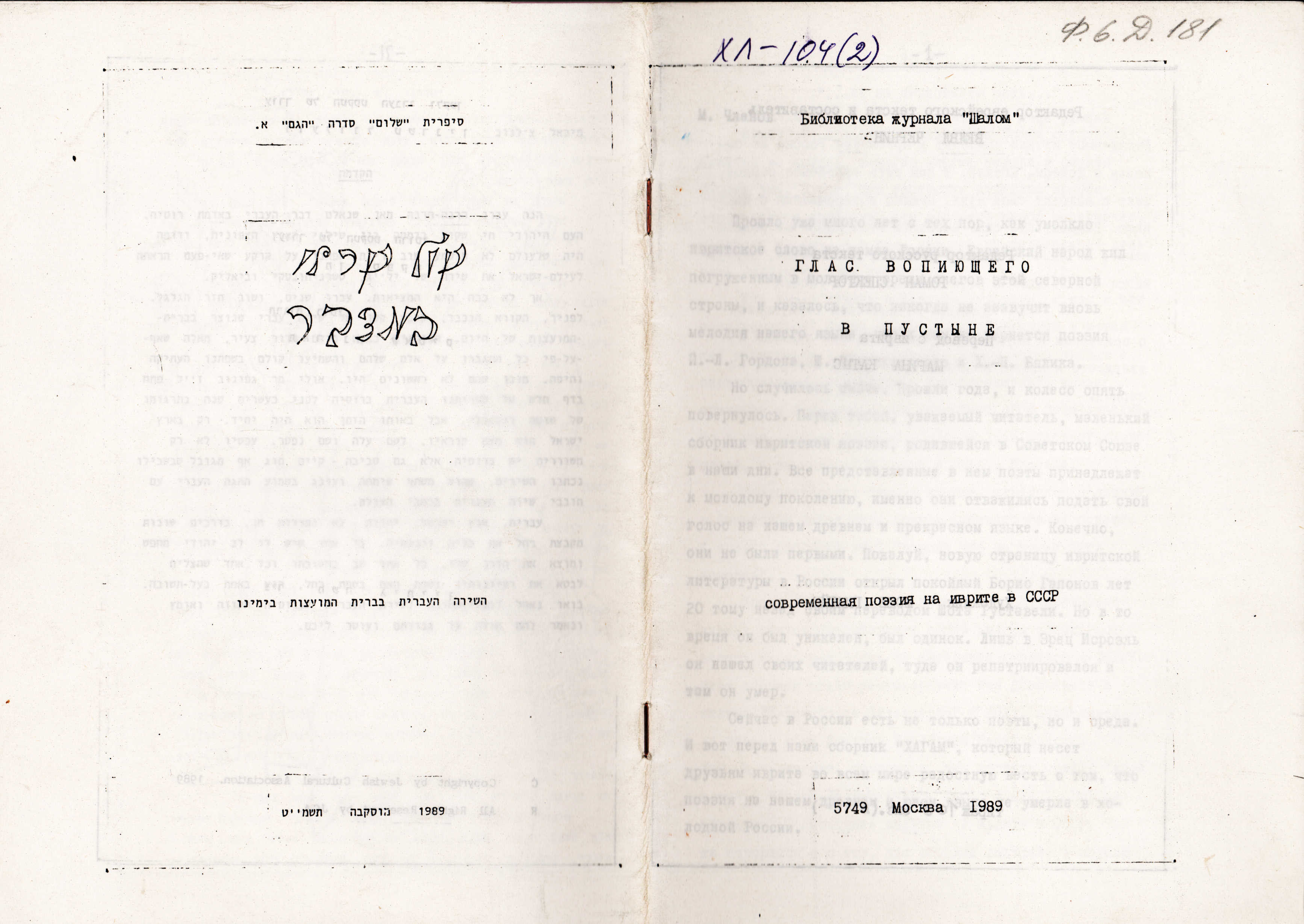 И в какой-то момент, я не помню, ко мне обратились мои друзья из Москвы, говорят: вот ты пишешь стихи на иврите, (никто же на иврите стихов не писал там, в Советском Союзе), пришли нам стихи почитать. А я их даже там декларировал где-то. Я прислал им стихи. По-моему, Михаил Анатольевич Членов попросил у меня эти стихи, и я про это все забыл. Вот, честно вам говорю, у меня это просто стерлось из памяти. И я уже здесь, в процессе подготовки нашего большого курса, искал что-то по каталогу национальной библиотеки Израиля. И вдруг я вижу сборник «Глас вопиющего в пустыне: современная поэзия на иврите в СССР», Москва, 1989 год.