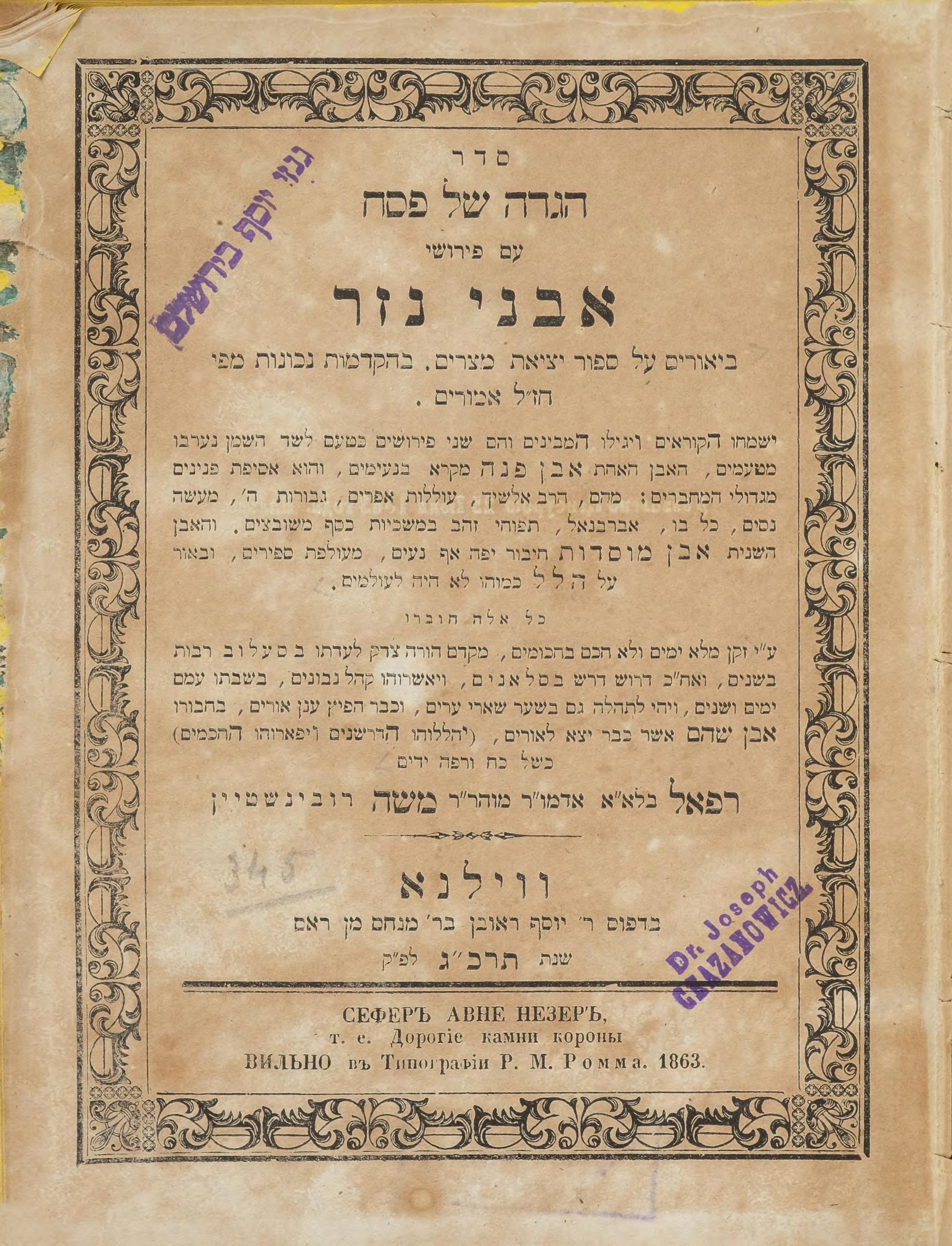 Опять тот же четкий шрифт, рамка, 1863 год. Для нас очень важны печати, которые здесь стоят. Это экземпляр, который мы взяли как пример из Национальной библиотеки Израиля, а это печать Иосифа Хазановича.