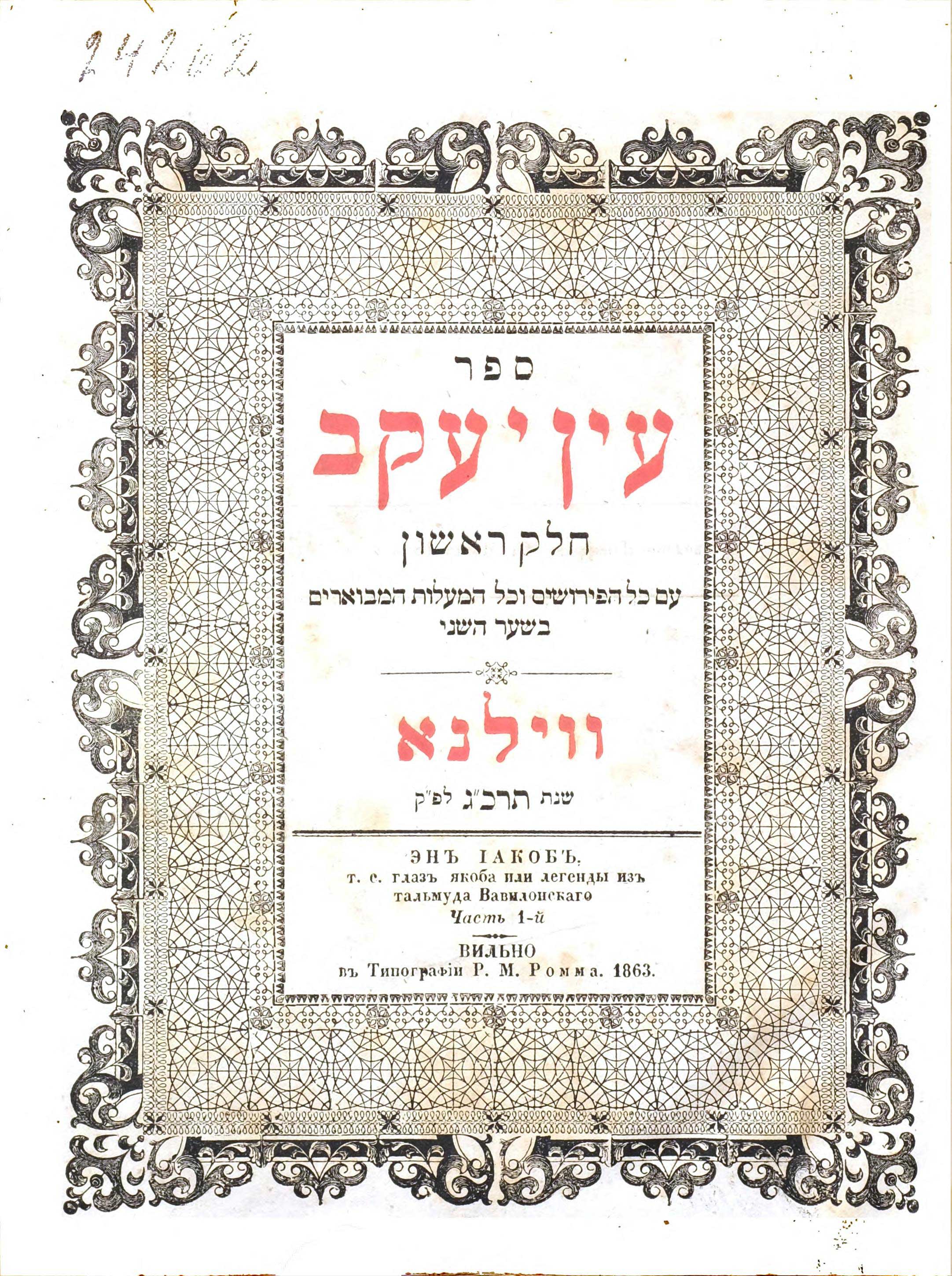 Такая же рамка, малый титульный лист. Эйн Яаков — книга очень важная, потому что в ней были собраны агадические части из всех Талмудов. Это пересказ Талмуда, но не галаха, не религиозные постановления, а то, что связано с душой народа, с агадой, с легендами. Но в данном случае для нас, опять же, важно: это очень хорошо напечатано.