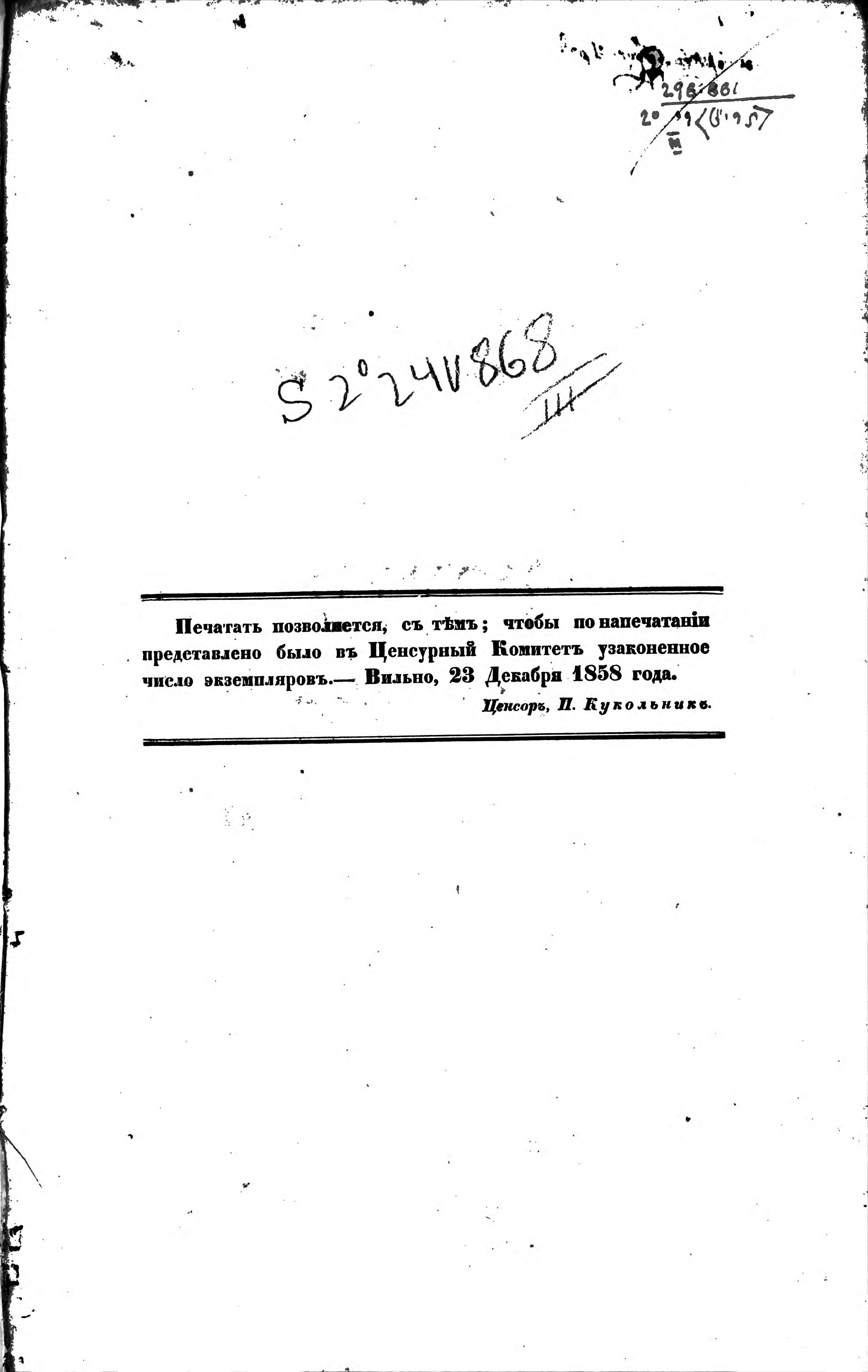 Вот смотрите: «Печатать позволяется с тем, чтобы по напечатанию представлено было в цензурный комитет узаконенное число экземпляров. Вильно, 23 декабря 1858 года». Цензор П. Кукольник.