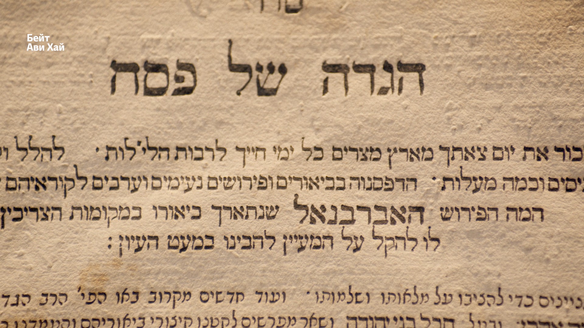 Крупным шрифтом на иврите мы видим классический текст самой пасхальной истории. Колонка справа — комментарии Абраванеля на иврите. Маленькие три столбика между текстом Агады — пояснение, что и в какой последовательности делать, сразу на трех языках.