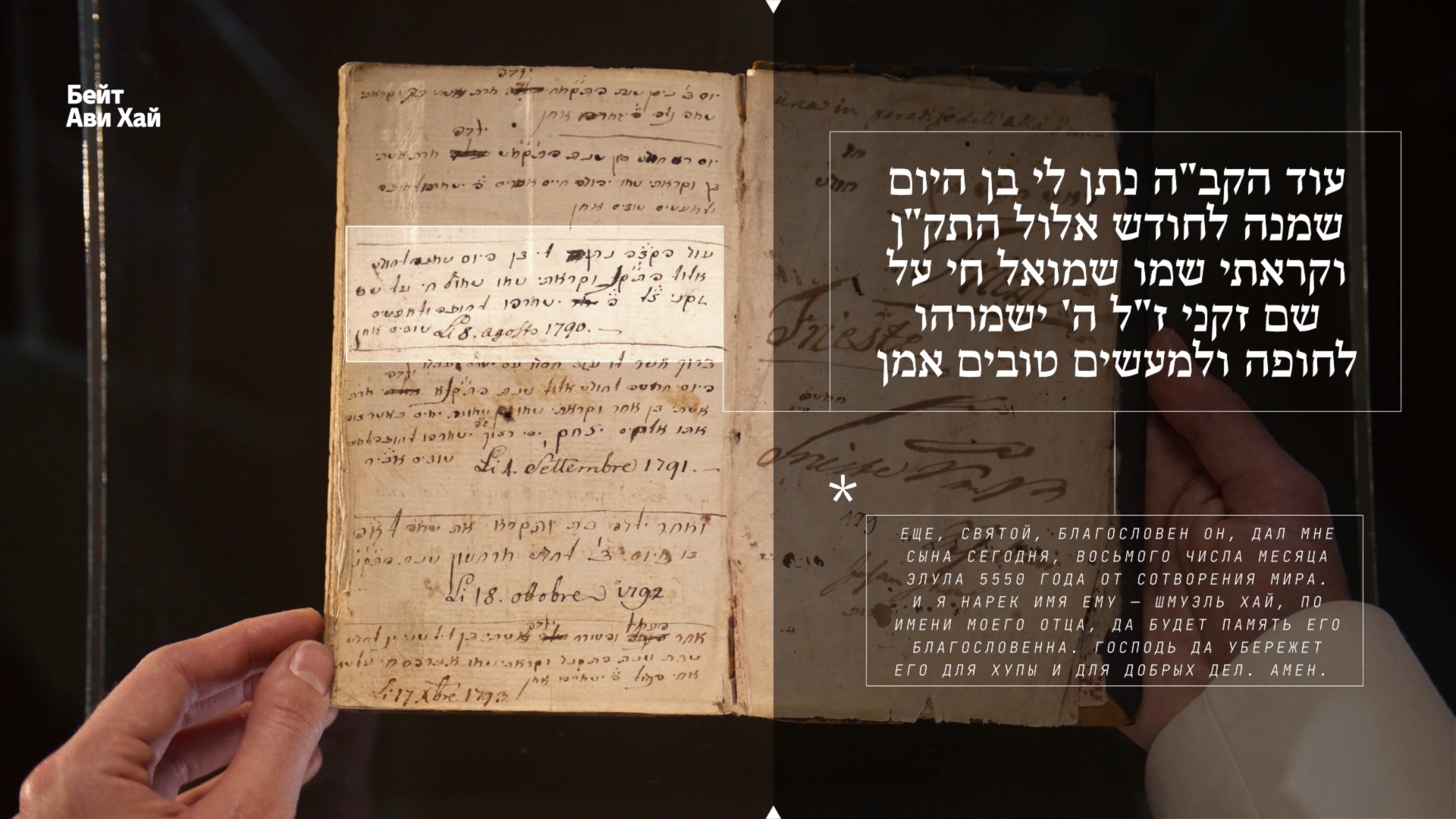 Еще, Святой, Благословен Он, дал мне сына сегодня, восьмого числа месяца элула 5550 года от Сотворения мира. И я нарек имя ему — Шмуэль Хай, по имени моего отца, да будет память его благословенна. Господь да убережет его для хупы и для добрых дел. Амен.
